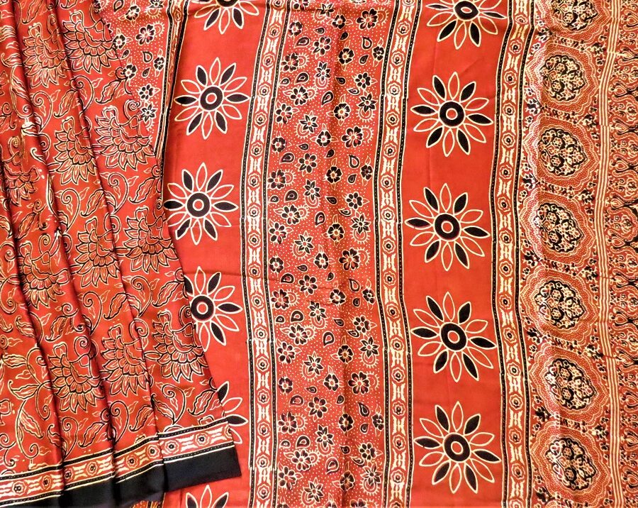 Modal silk saree enrich with ajrakh handprint. Saree is with blouse