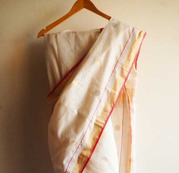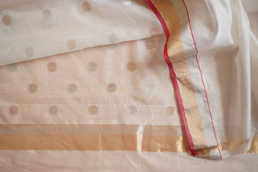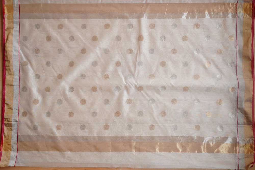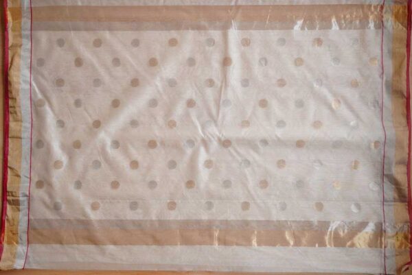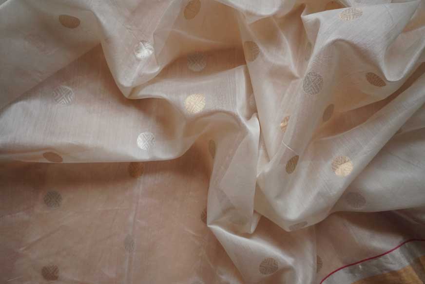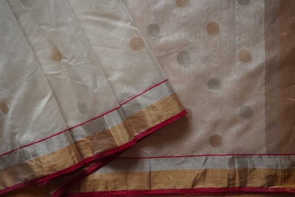 Handwoven chanderi saree with gold and silver zari ginni motifs all over saree and palla. Touch of pink color on borders adding grace on saree. Saree is with blouse