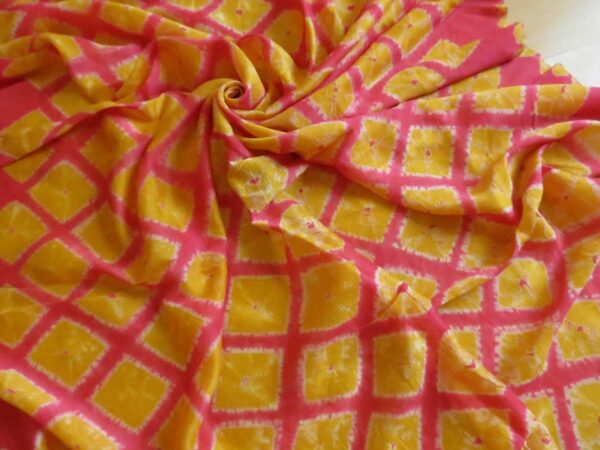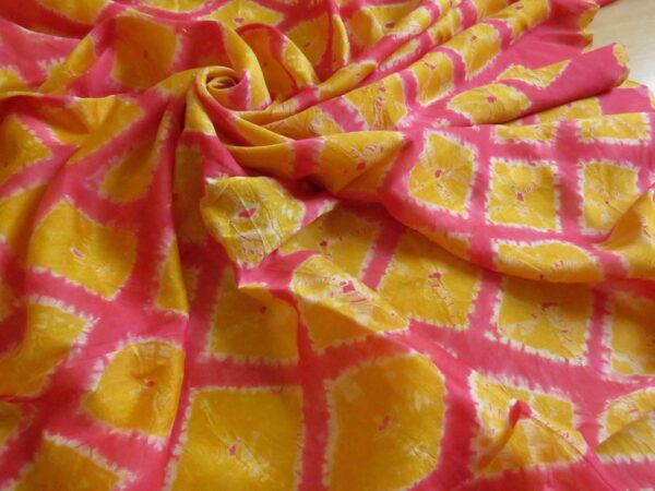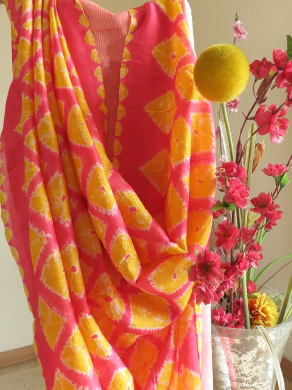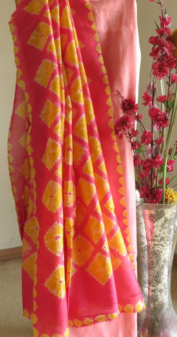 Handwoven kurta and dupatta set. Kurta has thin stipes of pink /yellow. Dupatta is enrich with shibori handcraft